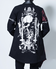 荘厳な十字架と二重のスカルが織り成す、退廃的でエレガントなゴシックグラフィック。合皮の襟がアクセントになったキレイめPUNKISHなジャケットです。