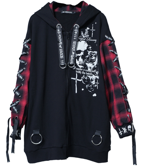 LACE UP SLEEVE DEVIL HORNS HOOD ジップ パーカ 黒+赤チェック